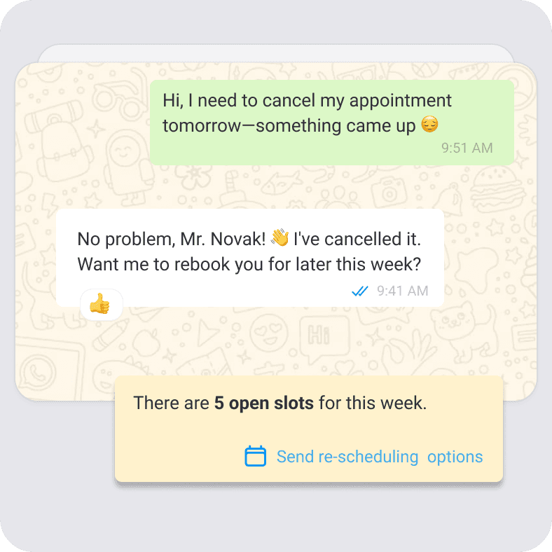 Clinics and wellness centers use Polser to run reactivation campaigns, turn conversations into bookings, and serve international clients in 35+ languages. All through WhatsApp.