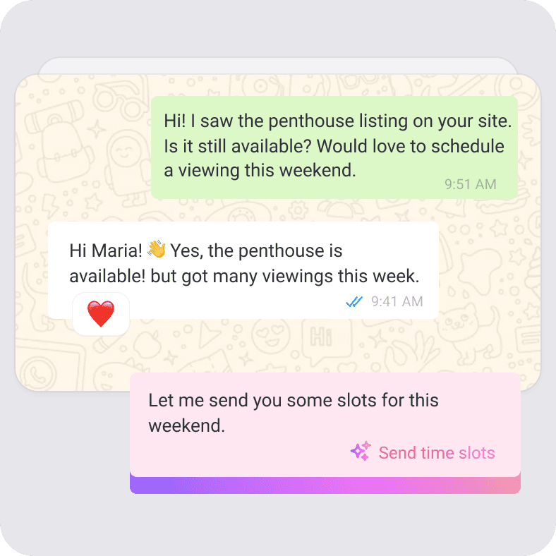Polser combines AI & automation with your human touch to manage enquiries at scale. Answer questions instantly, book viewings 24/7, and deliver personalised experiences that turn prospects into buyers.